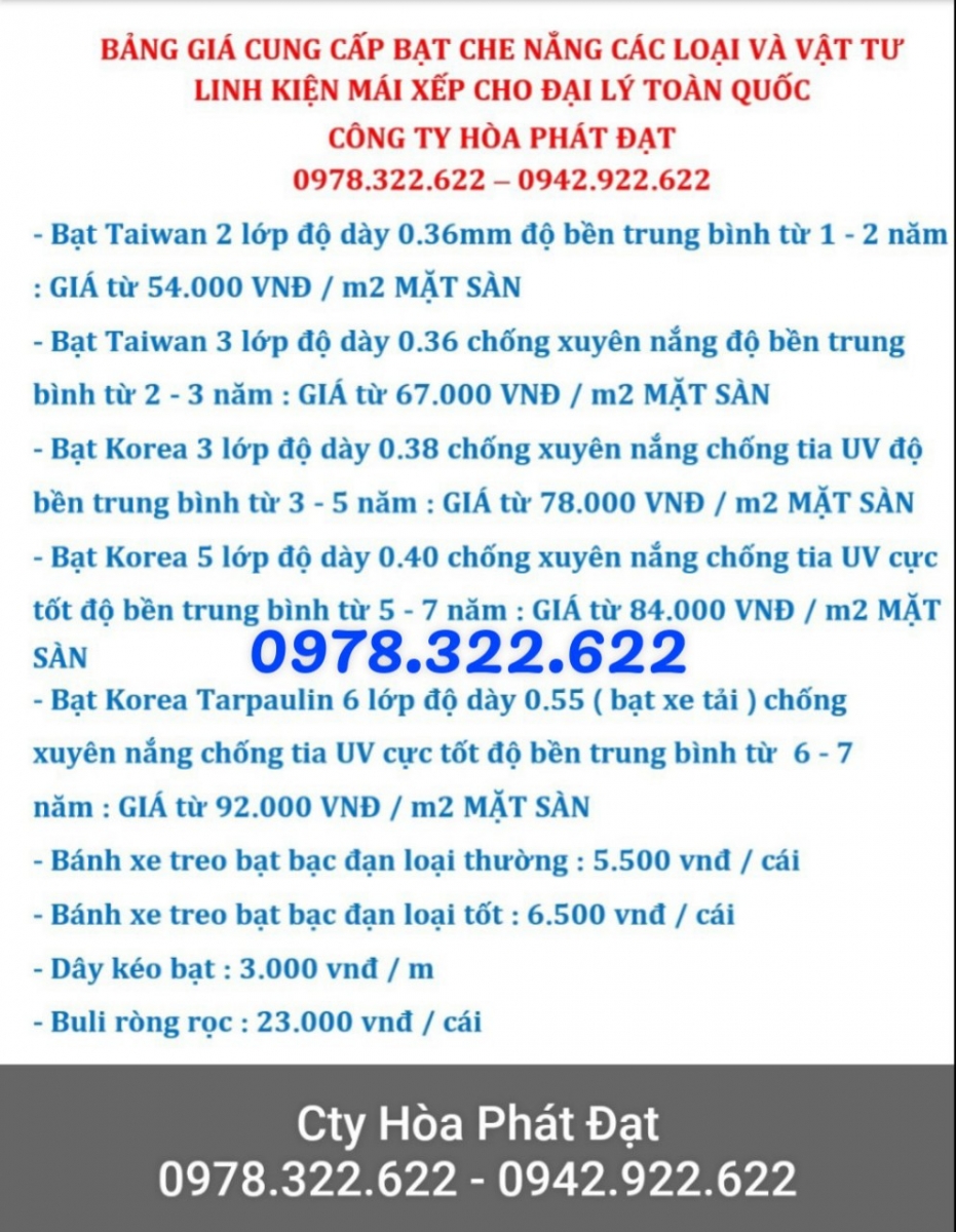 Đơn vị HÒA PHÁT ĐẠT chúng tôi là xưởng sản xuất chuyên may ép mái hiên di động, mái bạt che, mái kéo di động lượn sóng, kèm cung cấp đầy đủ tất cả các loại linh phụ kiện chuyên nghành mái bạt với giá thành rẻ nhất và hàng đảm bảo chất lượng bảo hành lên đến 36 tháng.